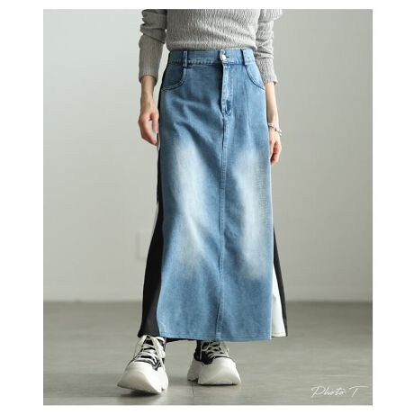 【スカート】 レディース デニム 異素材切替 ロング丈 後ろウエストゴム 体型カバー カジュアル