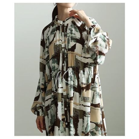 マルイウェブチャネル   /   サワアラモード   /   ワンピースドレス   /   ワンピース   /   【ワンピース】 レディース ニュアンス柄 アート柄 ロング丈 ドローコード ボリューム袖 体型カバー