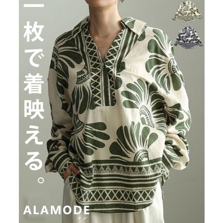 大胆なアフリカン柄が目を惹くスキッパーチュニック。首元の抜け感がすっきりとした印象を与え、さらっと着るだけでコーデが華やぎます。シンプルなボトムス合わせでもしっかり映える一枚です☆