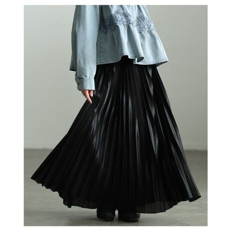 メタリックなブラックとシルバーが目を惹くプリーツスカート。長めの着丈でモード感たっぷりに仕上がり、ストンと落ちるシルエットでスッキリと着こなせます。シンプルなトップス合わせでも存在感抜群の一枚です☆