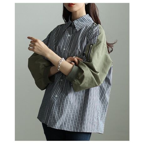 【トップス】 シャツ 異素材 ストライプ 無地 ミリタリー 長袖 リブ 羽織り グリーン ブルー