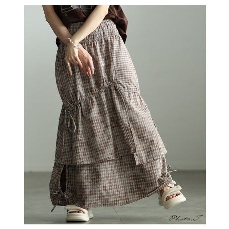 【スカート】 チェック アシンメトリー ドロスト 変形 ロング ウエストゴム スリット ブラウン