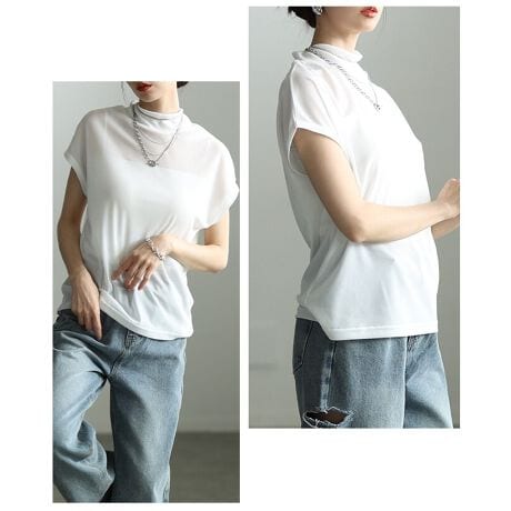 【トップス】 カットソー シアー モックネック ハイネック 半袖 フレンチ レイヤード シンプル