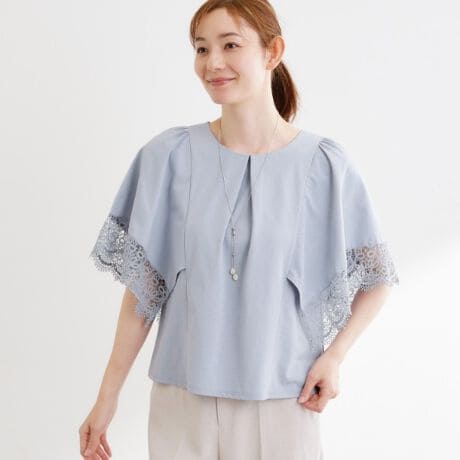 袖口にはレースをあしらい、ほどよいフレア感をプラスし、袖の下部分はタンクトップ型になっているので安心してお召しいただける仕様です。