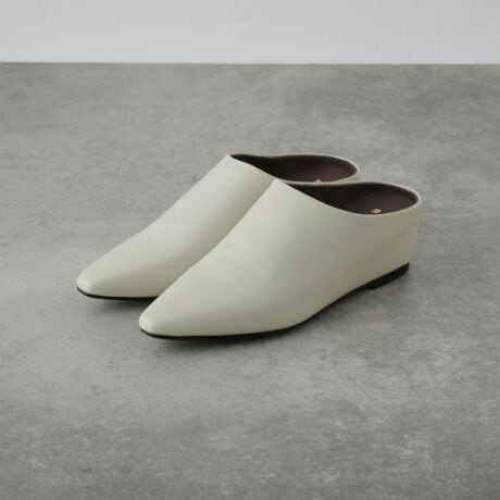 クリーンでスタイリッシュな印象を与えるレザーミュール。