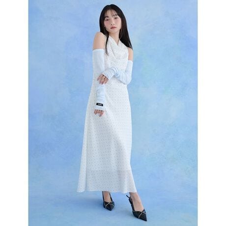 肩にタックで胸元にドレープを加えた、細やかなドット柄のロングワンピースです。ふんわり柔らかな胸元のドレープラインがドレンド感をアップ。ストンとしたIラインシルエットで仕上げました。後ろウエスト部分にはゴムシャーリングを加えてフィット感を出し、美スタイルに着こなしていただけます。アメスリで抜け感を加え、モードな印象に。背中のファスナーで着脱可能。縫い付け裏地付き。
