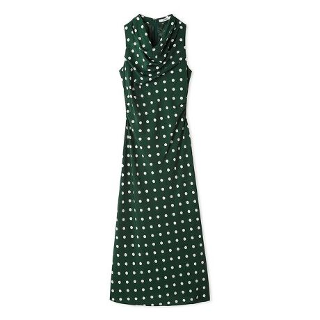 肩にタックで胸元にドレープを加えた、細やかなドット柄のロングワンピースです。ふんわり柔らかな胸元のドレープラインがドレンド感をアップ。ストンとしたIラインシルエットで仕上げました。後ろウエスト部分にはゴムシャーリングを加えてフィット感を出し、美スタイルに着こなしていただけます。アメスリで抜け感を加え、モードな印象に。背中のファスナーで着脱可能。縫い付け裏地付き。