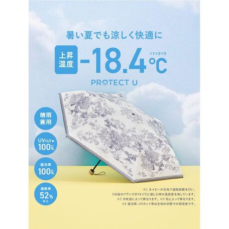 UVカット率100%※4、遮光率100%※4、遮熱率52%以上の高スペックPROTECT Uブランド素材でお作りした晴雨兼用折り畳み傘です。