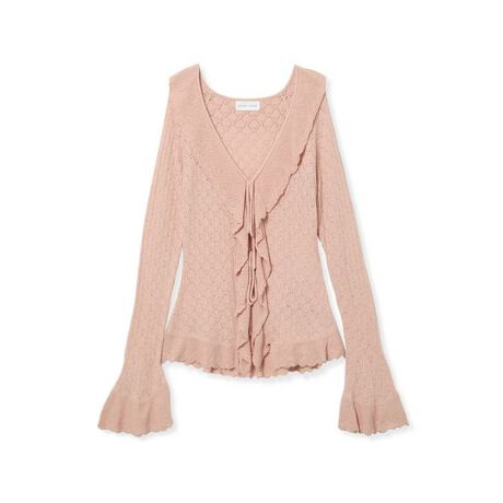 襟から裾にかけてのラッフルデザインが、優雅なニュアンスを放つカーディガン。