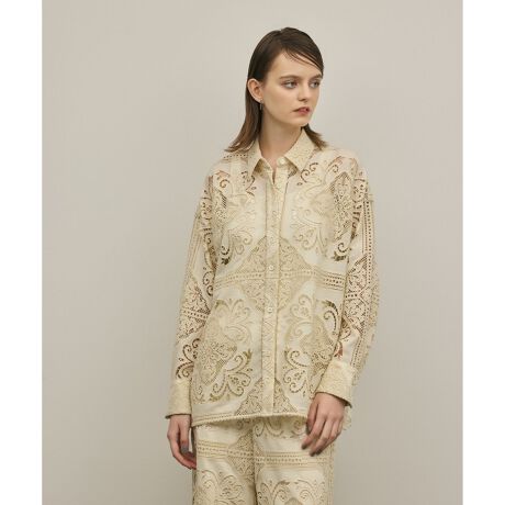 ダイナミックなカットワークで魅せる、リュクスなデザインのシャツ。柔らかなデシン素材にパネル柄の美しいカットワークを贅沢に入れた、一際目を惹くオリジナルの刺繍生地を使用。華やかなレースとゆったりとしたシルエットで、大人の余裕を纏う一枚に仕上がりました。コーディネートの主役にぴったりなシャツは、お手持ちのデニムや無地のパンツを合わせるだけでもおしゃれに決まります。お揃いのパンツを合わせた、ワンランク上のセットアップスタイルもぜひ。