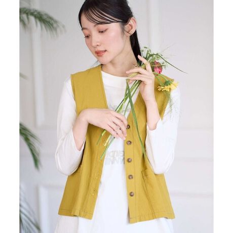 裏地を付けない一重仕立てで、軽やかに着られるベストです。アームホールはパイピングなどで縁をきれいに仕上げ、できるだけ縫い目が目立たないようにして、すっきりとした美しい仕上がりにこだわりました。ゆとりのあるBOXシルエットで体のラインを拾いにくく、重ね着もしやすいデザインです。後ろ丈を少し長くしたラウンド型のシルエットが、さりげなく体型をカバーしながらバランスよく見せてくれます。大きめのポケットと、たくさん並んだボタンがデザインのポイント。ボタン付けの糸は生地と同色にすることで、さりげない配色のアクセントを効かせました。さらに、生地より少し濃いステッチが全体を引き締め、シンプルな中にも表情のある一着に仕上げています。
