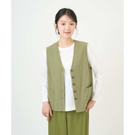 裏地を付けない一重仕立てで、軽やかに着られるベストです。アームホールはパイピングなどで縁をきれいに仕上げ、できるだけ縫い目が目立たないようにして、すっきりとした美しい仕上がりにこだわりました。ゆとりのあるBOXシルエットで体のラインを拾いにくく、重ね着もしやすいデザインです。後ろ丈を少し長くしたラウンド型のシルエットが、さりげなく体型をカバーしながらバランスよく見せてくれます。大きめのポケットと、たくさん並んだボタンがデザインのポイント。ボタン付けの糸は生地と同色にすることで、さりげない配色のアクセントを効かせました。さらに、生地より少し濃いステッチが全体を引き締め、シンプルな中にも表情のある一着に仕上げています。