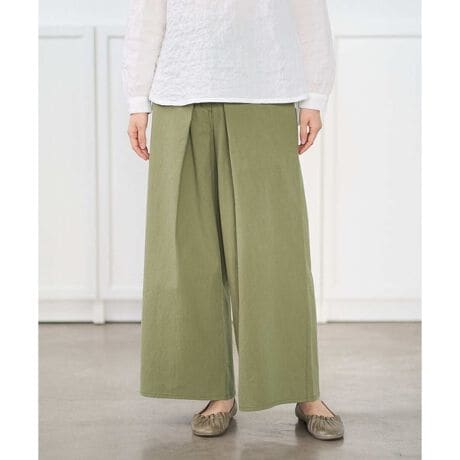 前開き仕様で仕上げた、ワイドストレートパンツです。ウエストはゴム仕様で、着脱しやすく快適なはき心地に仕上げました。ベルト通しも付いているため、きちんと感のあるスタイリングにも対応します。前身頃の左右にはタックを1本ずつ入れ、動くたびに表情が生まれる2枚重ね風のデザインがポイントです。リラックスした着心地と、きれい見えを両立した一着です。
