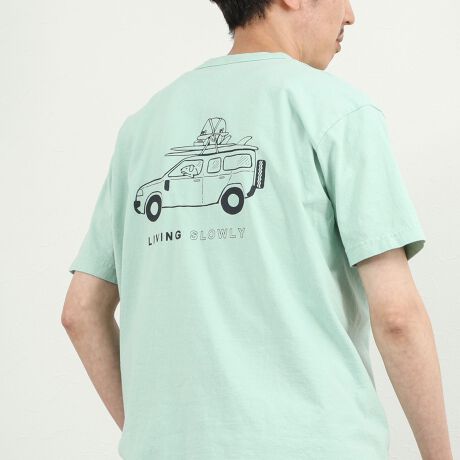 ・犬と車と「LIVING SLOWLY」のバックプリント