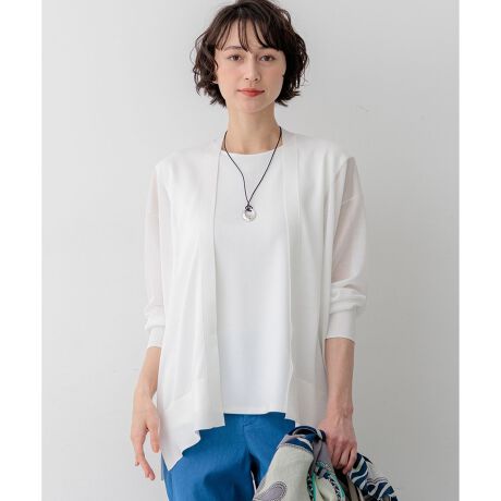 ゆったりとしたコクーンシルエットが女性らしい、ボタンのない着流しタイプのフロントオープンのカーディガンです。ヒップまで隠れる着丈が気になるボディラインを自然にカバーしつつ、前後差のある丸みを帯びたヘムラインが動きのある軽やかな印象を与えます。ボリューム感がありながらも、シアーで柔らかな素材の落ち感により、すっきりと着こなしていただけます。エレガントになりすぎない絶妙なバランスで、パンツスタイルからワンピースの羽織りまで、合わせるアイテムを選びません。夏の冷房対策や日よけとして、さっと羽織るだけで洗練されたスタイリングが完成します。カラーは、優しい印象のアイボリー(#003)、清潔感のあるホワイト(#001)、肌なじみの良いベージュ(#033)、爽やかなブルー(#070)、知的なネイビー(#075)の5色展開です。