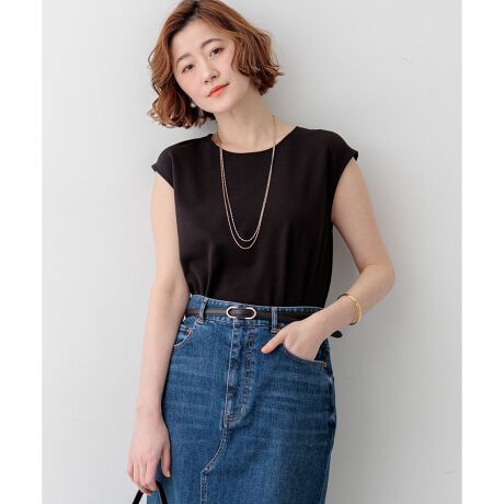 裾に向かって緩やかに広がるシルエットが女性らしい、上品なフレンチスリーブのトップスです。肩先を優しく覆う袖のデザインと、身体のラインを拾わない絶妙なゆとりが、気になる二の腕やお腹周りを自然にカバーしてくれます。後ろ裾はラウンドテールになっており、ヒップにかかる丈感が安心感をプラスすると同時に、アウトで着用した際にも軽やかな動きを演出するポイントになっています。シンプルなデザインのため、きれいめなジャケットやカーディガンのインナーとして着れば通勤シーンに、デニムやワイドパンツと合わせれば休日のリラックススタイルにと、オンオフ問わず幅広いコーディネートで活躍します。カラーは、清潔感がありどんなボトムスとも相性の良いホワイト(#001)と、シックで引き締まった印象を与えるブラック(#005)の2色展開です。