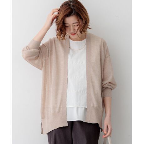 ゆったりとしたコクーンシルエットが女性らしい、ボタンのない着流しタイプのフロントオープンのカーディガンです。ヒップまで隠れる着丈が気になるボディラインを自然にカバーしつつ、前後差のある丸みを帯びたヘムラインが動きのある軽やかな印象を与えます。ボリューム感がありながらも、シアーで柔らかな素材の落ち感により、すっきりと着こなしていただけます。エレガントになりすぎない絶妙なバランスで、パンツスタイルからワンピースの羽織りまで、合わせるアイテムを選びません。夏の冷房対策や日よけとして、さっと羽織るだけで洗練されたスタイリングが完成します。カラーは、優しい印象のアイボリー(#003)、清潔感のあるホワイト(#001)、肌なじみの良いベージュ(#033)、爽やかなブルー(#070)、知的なネイビー(#075)の5色展開です。