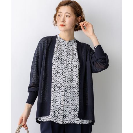ゆったりとしたコクーンシルエットが女性らしい、ボタンのない着流しタイプのフロントオープンのカーディガンです。ヒップまで隠れる着丈が気になるボディラインを自然にカバーしつつ、前後差のある丸みを帯びたヘムラインが動きのある軽やかな印象を与えます。ボリューム感がありながらも、シアーで柔らかな素材の落ち感により、すっきりと着こなしていただけます。エレガントになりすぎない絶妙なバランスで、パンツスタイルからワンピースの羽織りまで、合わせるアイテムを選びません。夏の冷房対策や日よけとして、さっと羽織るだけで洗練されたスタイリングが完成します。カラーは、優しい印象のアイボリー(#003)、清潔感のあるホワイト(#001)、肌なじみの良いベージュ(#033)、爽やかなブルー(#070)、知的なネイビー(#075)の5色展開です。