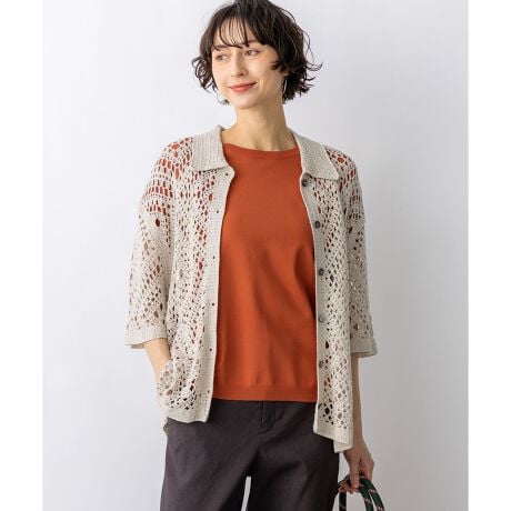 かぎ針編みのような刺繍レースが目を惹く、存在感抜群のポロカーディガンです。襟や前立てのシンプルな柄でトリミングすることで大人の女性でも上品に着こなせる一枚に仕上げました。身体のラインを拾いすぎない程よくゆとりのあるシルエットが、リラックス感のある着心地を叶えます。 ボタンを留めて一枚着風に着るのはもちろん、インナーにキャミソールやタンクトップを合わせて、カーディガンとして羽織るレイヤードスタイルもおすすめです。カラーは、清潔感があり顔周りを明るく見せるホワイト(#001)、シックで洗練された印象を与えるブラック(#005)、肌なじみが良くナチュラルな雰囲気のベージュ(#033)の3色展開です。