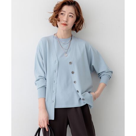袖から身頃にかけて適度なボリュームを持たせることで立体的なフォルムを出し、メリハリのある美しいシルエットに仕上げた大人のVネックカーディガンです。ボタンを閉めた際に前裾がスリットのようにさりげなく開くデザインが、スタイリングに軽やかな抜け感を演出します。襟を少し後ろに抜いて背中にボリュームを持たせることで、より女性らしく洗練された雰囲気に着こなせます。同素材のトップスとセットアップで合わせれば、オフィスなどのきちんとしたシーンにも対応します。カラーは、着回しやすいホワイト(#001)、知的な印象を醸すネイビー(#075)、パッと目を惹くピンク(#012)、爽やかなスカイブルー(#072)、ニュアンス感のあるダークブラウン(#035)、やわらかな雰囲気のベージュ(#033)の6色展開です。