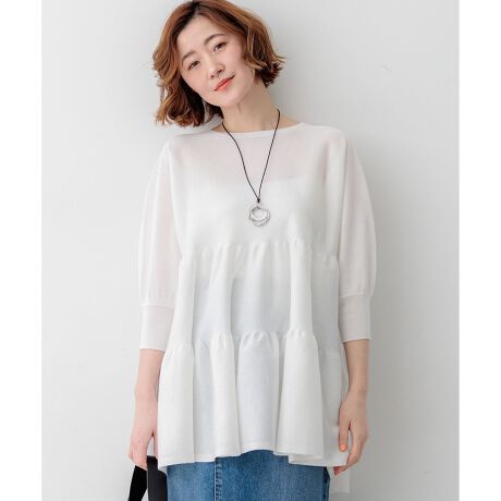 大人の女性にも着こなしやすい、シアー感を抑えた程よい甘さのティアードデザインが魅力のチュニック丈プルオーバーです。切り替え部分を縫い合わせずに編み続きにすることで、縫い代のごわつきやハリを抑え、すとんと落ちる美しいシルエットを実現しました。ボリューム感がありながらも着膨れせず、すっきりとスタイルアップして見せてくれる優秀な一枚です。ヒップが隠れる安心の着丈と、体のラインを拾わないドルマンスリーブが、気になる部分を自然にカバーしてくれます。細身のパンツと合わせたメリハリのあるスタイリングや、ワイドパンツと合わせたリラックス感のあるコーディネートなど、合わせるボトムスを選ばず幅広いシーンで活躍します。カラーは、清涼感のあるホワイト(#001)、シックで万能なブラック(#005)、落ち着いた雰囲気のダークブラウン(#035)の3色展開です。