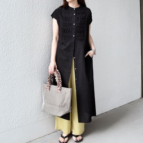 フロントにたっぷり施したタックがポイントで、華やかな雰囲気に仕上げたシャツワンピース。