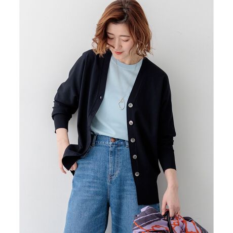 袖から身頃にかけて適度なボリュームを持たせることで立体的なフォルムを出し、メリハリのある美しいシルエットに仕上げた大人のVネックカーディガンです。ボタンを閉めた際に前裾がスリットのようにさりげなく開くデザインが、スタイリングに軽やかな抜け感を演出します。襟を少し後ろに抜いて背中にボリュームを持たせることで、より女性らしく洗練された雰囲気に着こなせます。同素材のトップスとセットアップで合わせれば、オフィスなどのきちんとしたシーンにも対応します。カラーは、着回しやすいホワイト(#001)、知的な印象を醸すネイビー(#075)、パッと目を惹くピンク(#012)、爽やかなスカイブルー(#072)、ニュアンス感のあるダークブラウン(#035)、やわらかな雰囲気のベージュ(#033)の6色展開です。