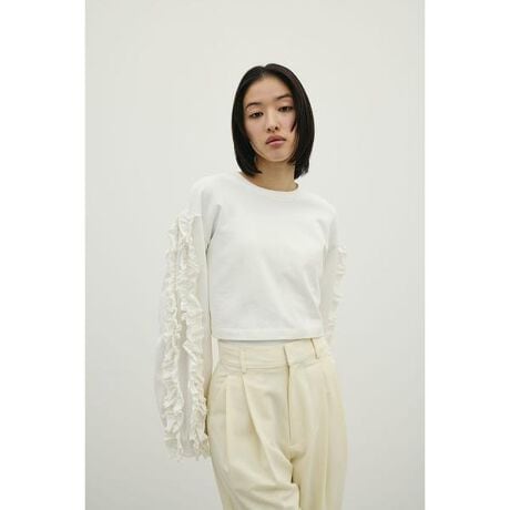 [型番:500JSB80-0541]モデル身長166cm(FREEサイズ着用)シンプルながら袖に沿って施されたフリルが女性らしく華やかなフリルスリーブトップ。程よく厚みのあるカット素材を使用。カジュアルにもきれいめにも着まわせるデイリーに活躍する一枚です。短丈デザインでボトムとのバランスが取りやすく、ハイウエストパンツやスカートとの相性も抜群。透け感なし、ストレッチあり。【お手入れ方法】マシンウォッシュ可