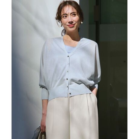天竺編みで仕立てたドルマンスリーブのカーディガンです。前立てを細く設定することですっきりとさせ、洗練された大人の印象に仕上げました。袖口の長めのリブにはスリットを入れ、手元に抜け感と女性らしさをプラスしています。コンパクトな丈感のため、ボリュームのあるボトムスやワンピースともバランスよく合わせていただけます。羽織りとしてはもちろん、前ボタンを全て留めてプルオーバー風に着こなすのもおすすめです。カラーは、着回しやすいアイボリー(#003)、ブラック(#005)、ベージュ(#033)に加え、コーディネートのアクセントになるピンク(#012)、爽やかなスカイブルー(#072)、WEB&一部店舗限定カラーのシックなネイビー(#075)の計6色展開です。