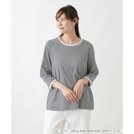 すっきりとした首元と袖口にあしらわれた無地の切り替えが、装いに爽やかなアクセントを加えます。均一な間隔で引かれた横縞模様が、心地よいリズムを生み出し、クリーンな印象を与えます。身体のラインを拾いすぎない、ほどよいゆとりのあるシルエットで、快適な着心地を叶えました。手首がのぞく袖丈は、見た目にも軽やかで、一枚で着るだけで洗練された雰囲気を演出します。