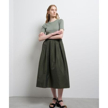 スカート部分のタフタは、繊細な光沢と程よい透け感が特徴のワッシャータフタを採用。薄手ながらもハリがあり、加工により表面にナチュラルなシワ感と表情が生まれています。トップスのテレコは表面にブライト糸を使用しており、カジュアル過ぎず上品な印象です。
