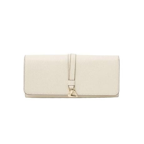 カッティングハートにパールをあしらったチャームを、ベルトデザインにぶら下げたディテールが印象的で、フェミニンさと上品さを絶妙にバランスよく表現した「カルノ」シリーズ。オフホワイトやピンクを基調とした優しいカラーリングには、ゴールド金具を効かせることで全体を引き締め、甘くなりすぎない洗練された印象に仕上げています。ハートモチーフとパールの組み合わせが、持つたびに気分を高めてくれるデザインポイントに。淡く柔らかなカラー展開がコーディネートにもなじみやすく、デイリー使いはもちろん、ギフトにもおすすめのシリーズです。【メーカーサイズ寸法(実寸)】サイズ:H:8.5/W:19/D:3.5/重さ:200g/外装背面フリーポケット:1/内装札入:2/小銭入(仕切り有):1/フリーポケット:3/カードスロット:28