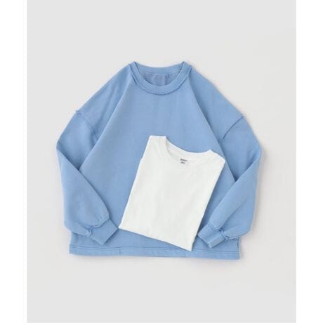 シンプルなクルーネックスウェットと、裾からほどよく覗くTシャツがセットになったレイヤードトップス。