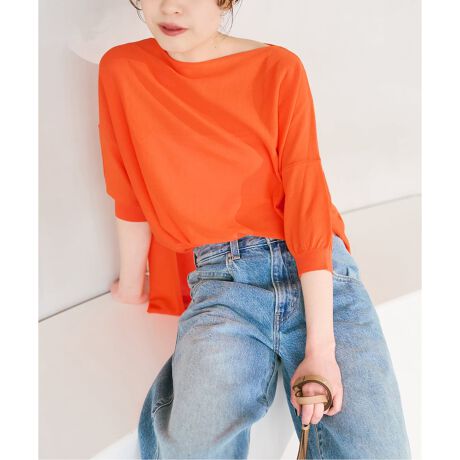 サイズ感:ドルマンスリーブで身幅はゆとりがありますが、袖はすっきりしているので大きく見えすぎないのが嬉しい。ボートネックで首回りはサイドに開くのが女性らしい印象に。