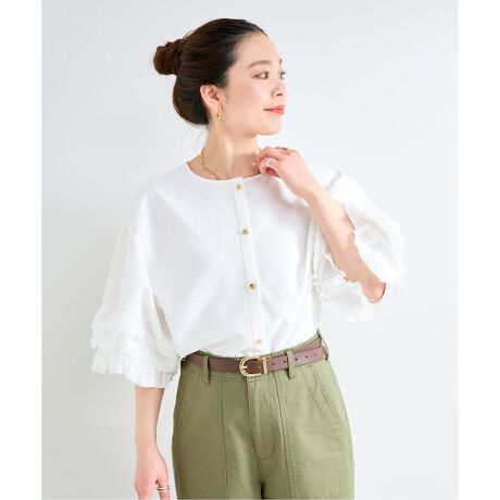 UVケア&接触冷感機能素材を使用したフリル袖ブラウス。