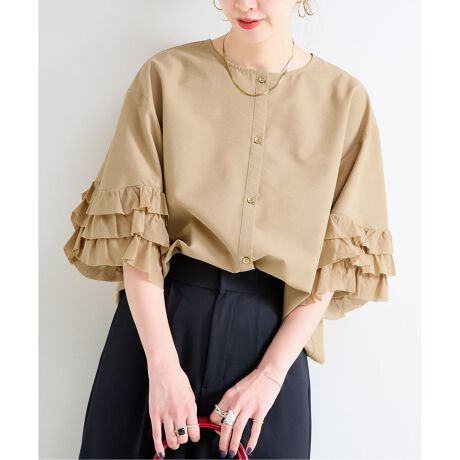 UVケア&接触冷感機能素材を使用したフリル袖ブラウス。