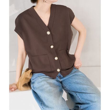 華やかなパールボタンが目を引く、大人のサマーニットベスト。