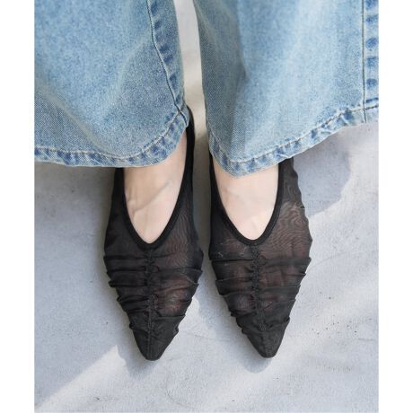 トレンドのシアー素材を使用し、たっぷりと寄せたギャザーの立体感が目を引くスリングバックシューズ。