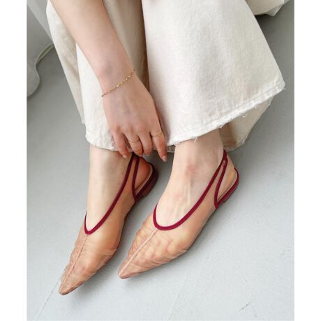 トレンドのシアー素材を使用し、たっぷりと寄せたギャザーの立体感が目を引くスリングバックシューズ。