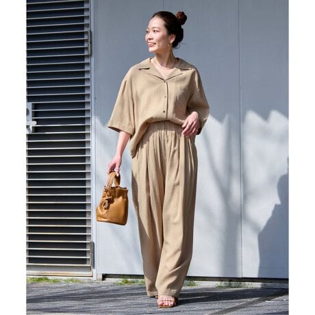 軽やかでさらりとしたタッチで肌離れがよく、軽い着心地が魅力。シャツはバランスの取りやすいクロップド丈に、抜け感のあるオープンカラーの半袖デザイン、袖口切り替えをいれたので折り返しても表情がでます。パンツはウエストゴムのイージータイプ。フロントタックがデザインとなり、リラックスした穿き心地ながら落ち感のあるシルエットで上品に仕上げました。