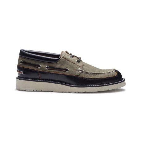 洗練されたデッキデザインシューズ、ミリタリー由来のタフなパラフィン加工生地に上質なレザーを融合させました。