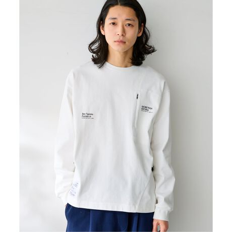 フロントとバックに施された控えめなテキストプリント、独特の切り替えラインが特徴のロングスリーブTシャツ。