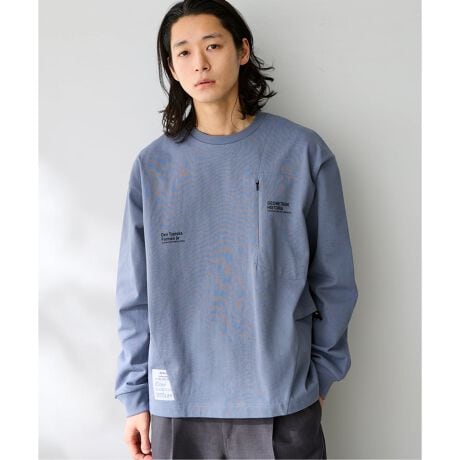 フロントとバックに施された控えめなテキストプリント、独特の切り替えラインが特徴のロングスリーブTシャツ。