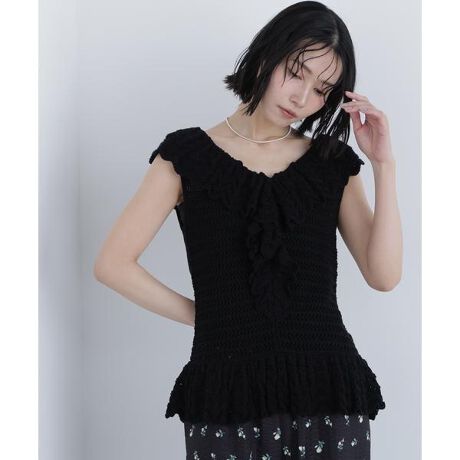 柄編みが印象的なラッフルニット。ふんわりラッフルで華やかさをプラスし、表情ゆたかな編地が一枚でも存在感のあるデザイン。軽やかな着心地でデイリーに取り入れやすく、コーディネートの主役になるアイテムです。<素材>やわらかく程よい厚みのニット素材を使用。表面感のある柄編みで、軽やかに着られます。<詳細>仕様・開閉なし裏地・なし透け感・ややあり / 光沢・なし / 伸縮性・あり生地の厚さ・普通※モデルの着用画像の場合、光の当たり具合により、実際の色味と異なって見えることがございます。色味は、商品単体の画像をご参照ください。