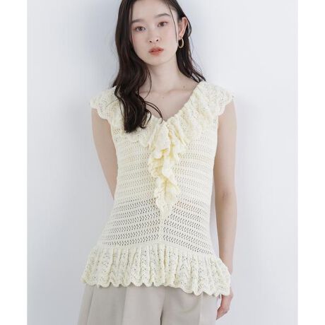 柄編みが印象的なラッフルニット。ふんわりラッフルで華やかさをプラスし、表情ゆたかな編地が一枚でも存在感のあるデザイン。軽やかな着心地でデイリーに取り入れやすく、コーディネートの主役になるアイテムです。<素材>やわらかく程よい厚みのニット素材を使用。表面感のある柄編みで、軽やかに着られます。<詳細>仕様・開閉なし裏地・なし透け感・ややあり / 光沢・なし / 伸縮性・あり生地の厚さ・普通※モデルの着用画像の場合、光の当たり具合により、実際の色味と異なって見えることがございます。色味は、商品単体の画像をご参照ください。