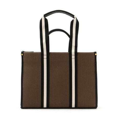 キャンバス地のように見えるフェイクレザーに、プレッピーな配色ショルダーテープをあしらったスクエア型トートバッグ。短いハンドルと長いショルダーの2way仕様で、短いハンドルを使わない時はボディの中に倒して収納することも出来ます。内側のポケットにはA4書類やノートパソコンが入るサイズ感で、お仕事からデイリーまで幅広く活躍。汚れが付きにくい素材も嬉しいポイントです。※モデルの着用画像の場合、光の当たり具合により、実際の色味と異なって見えることがございます。色味は、商品単体の画像をご参照ください。