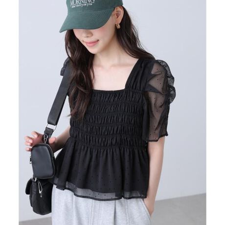 フロッキードットシャーリングペプラムブラウス