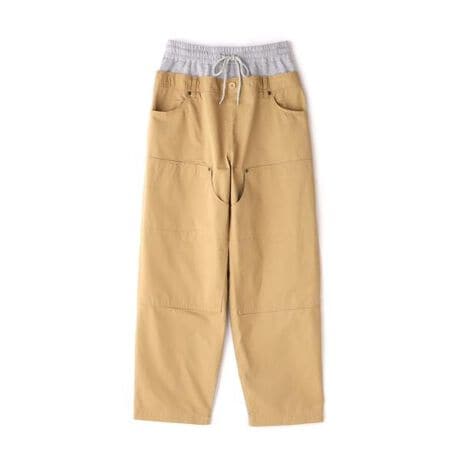 前身頃には薄手のチノ素材を使用し、ダブルニーやリベット、補強ステッチなど、ワークディテールを落とし込んだデザインが特徴です。
