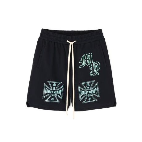 太ももあたりに大きくブランドロゴの刺繍、両裾とバックにはクロスとラインストーンが施されたスウェットショーツ。