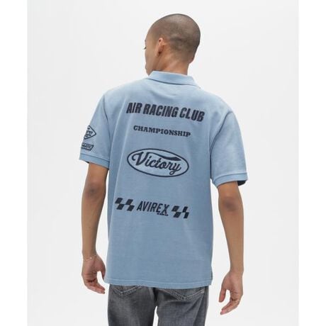 ・『Avirex Air Racing Club』をイメージしたポロシャツ・レースチーム風のモチーフデザイン・フロント・バックともにボディーカラーになじむ刺しゅう・製品染めによる柔らかな風合いと色落ち感が魅力・3色展開【AVIREX/アヴィレックス】1975年にアメリカ空軍のコントラクターとして創業し、フライトジャケットを供給した事でその認知度を飛躍的に高めた。